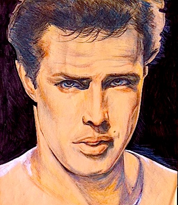 (motorcycle silo with funky front wheel rendered in marker, biker chick done in watercolor and pencil, Marlon/James combo created with colored pencil and marker)