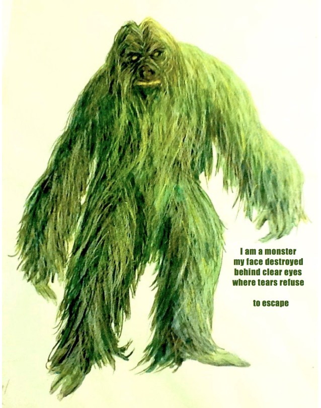 This piece inspired by my face, currently a disaster of stress rash. Apparently, holding back, in an attempt to be monstrously strong, isn’t good for you. I can now use my face like a 70’s mood ring. Never believed I was vain, but lately I’m hiding in the shadows along with my creatures.