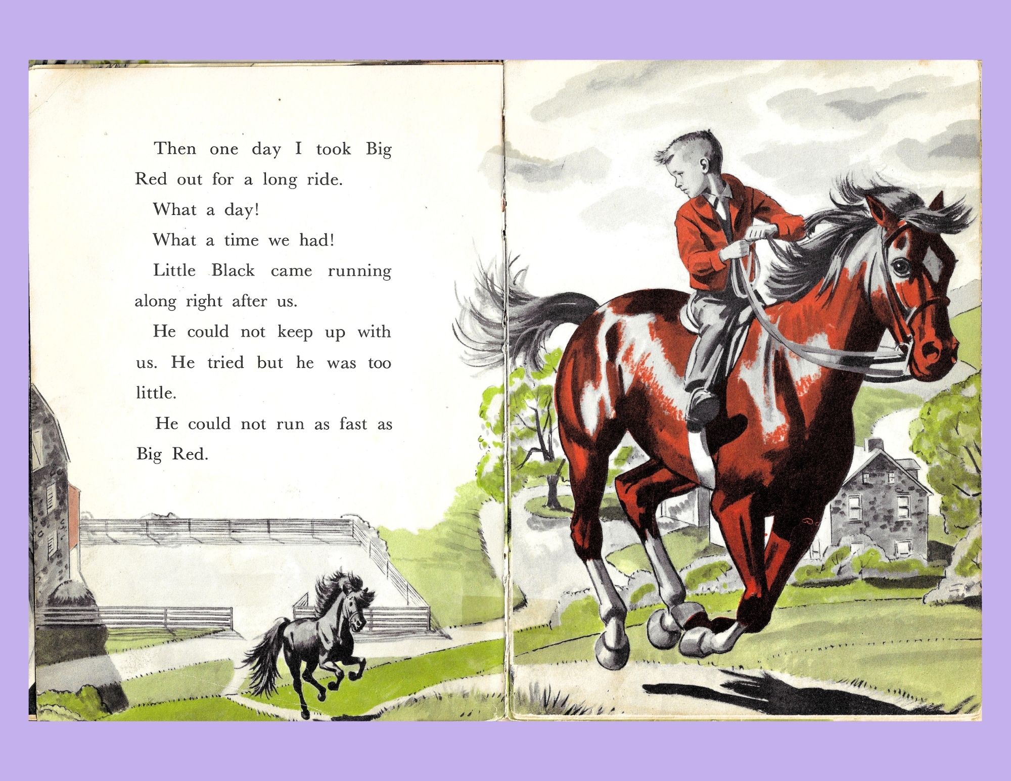 ….Red Sweater Boy in his red jacket astride Big Red (red – the primary look-at-my-power color) gallop away from the farm. In a sheer moment of panic at the loss of his friend, Little Black charges after the couple.